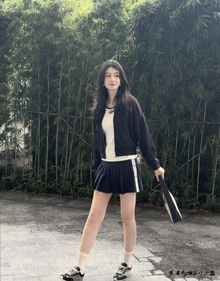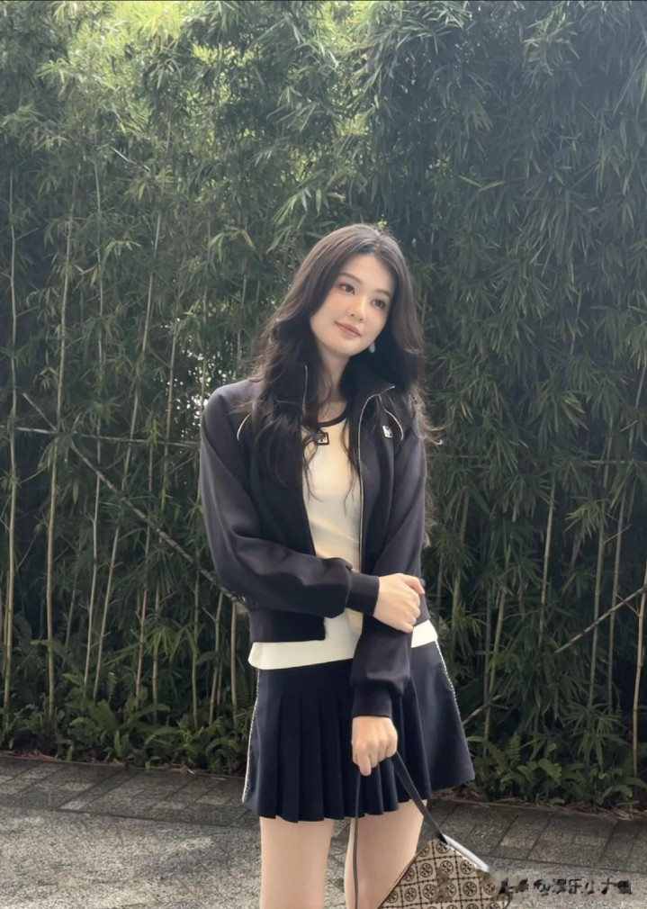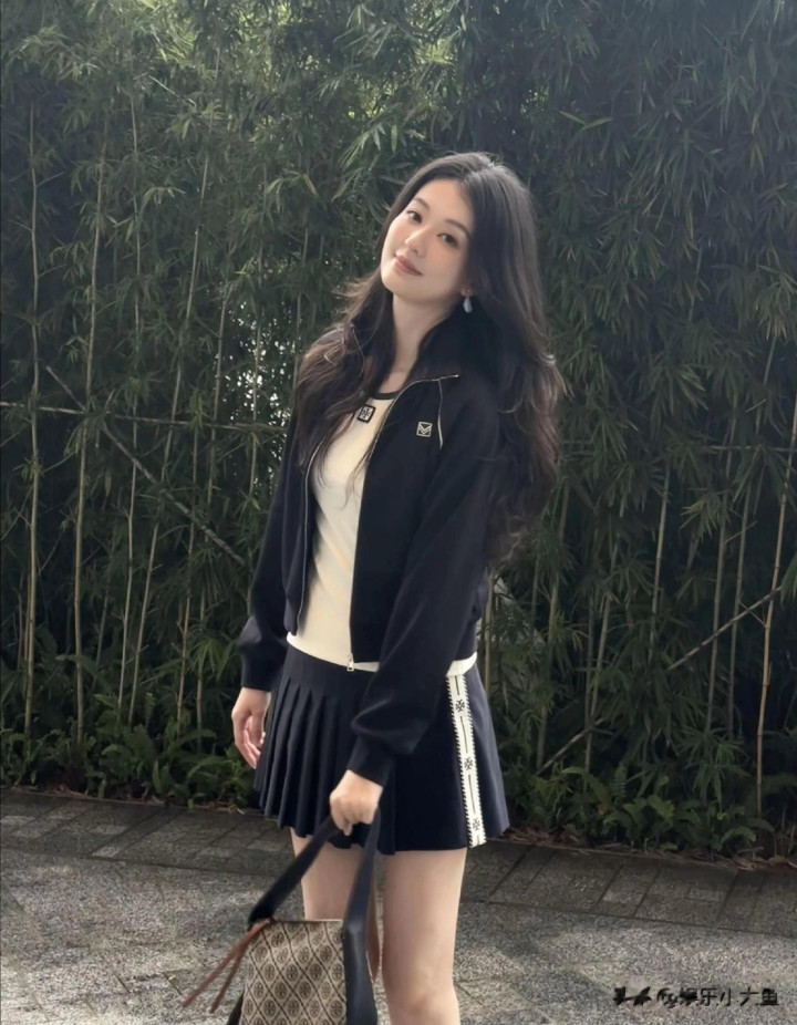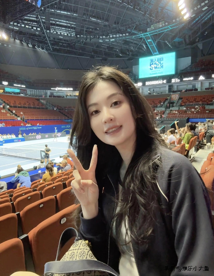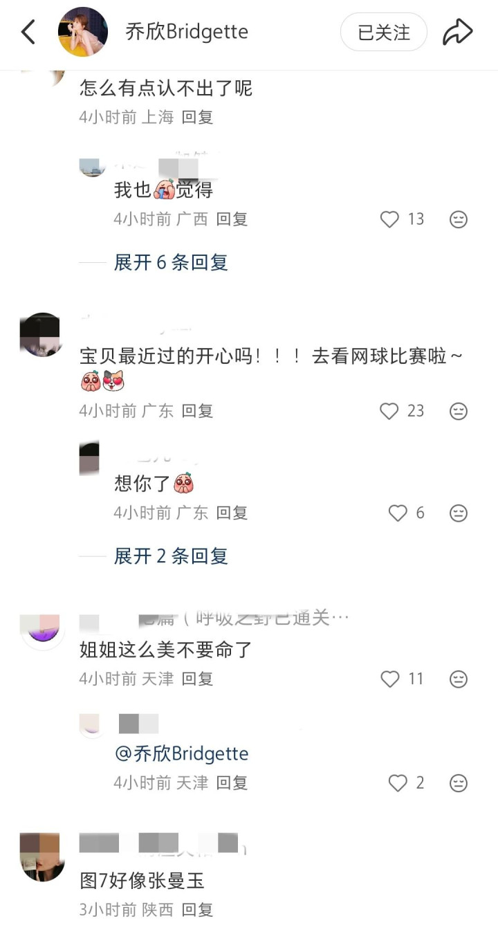 > 乔欣去看网球比赛了, 穿休闲外套搭配百褶裙, 网友: 有点认不出了